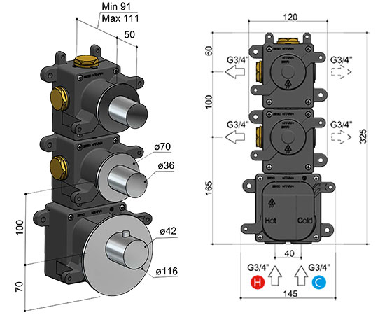 Miscelatore termostatico da incasso ad alta portata, con 2 rubinetti d'arresto