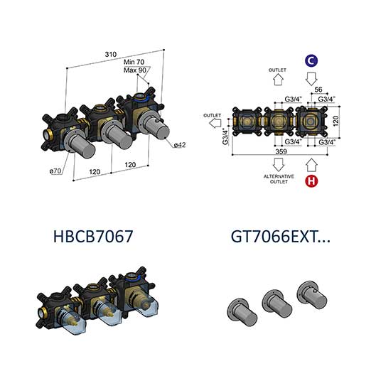 Miscelatore termostatico da incasso per doccia, con 2 rubinetti d'arresto